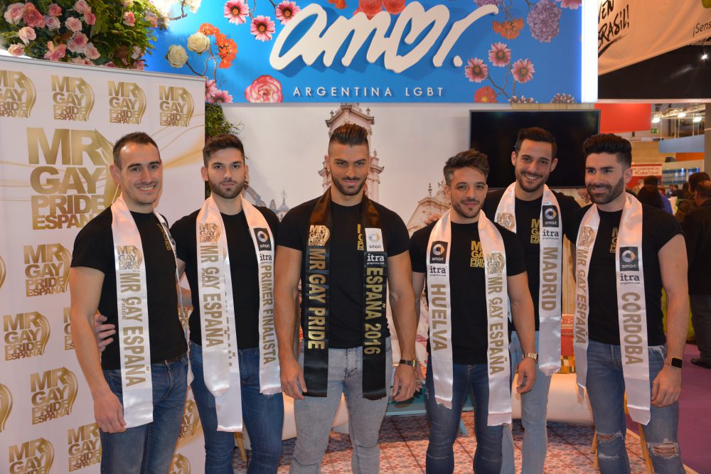 El actual Mr. Gay Pride España 2016, junto con alguno de los finalistas estuvieron fomentando el turismo LGTB con acciones especiales en el stand de Argentina.